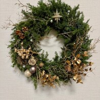 - ヒムロ杉グリーン×ゴールドクリスマスリースにメリアをプラスした オーダーのクリスマスリース …