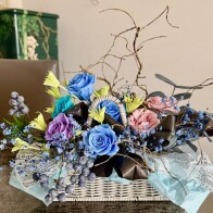 - ソーダブルーとカルビアンブルーの薔薇をグレーのバスケットに。。。 ピュア…