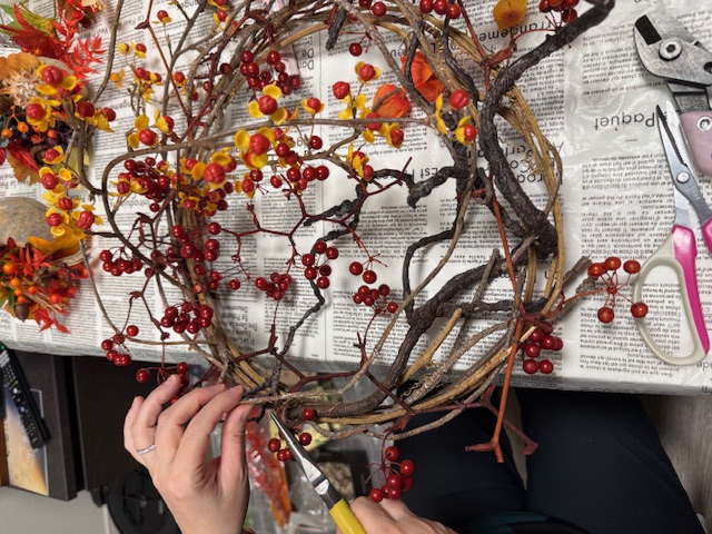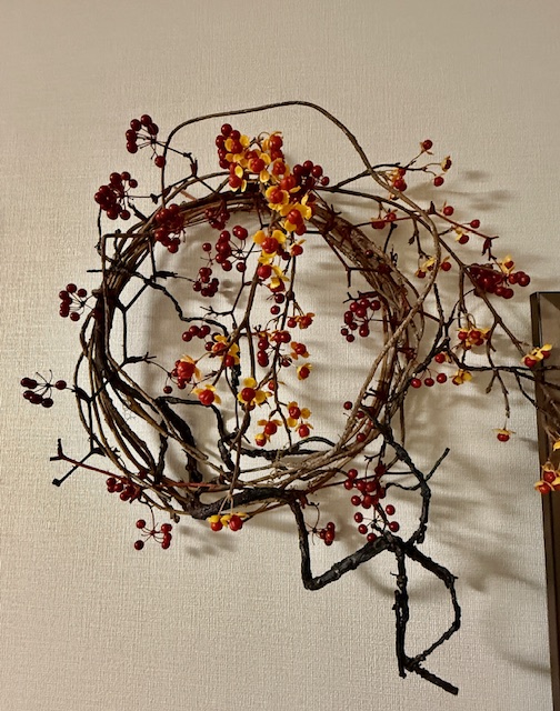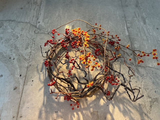 プリザーブド赤い実の「サンキライ」とアーティフィシャルフラワーの「蔓ウメモドキ」で 動きあるダイナミックな秋のリース