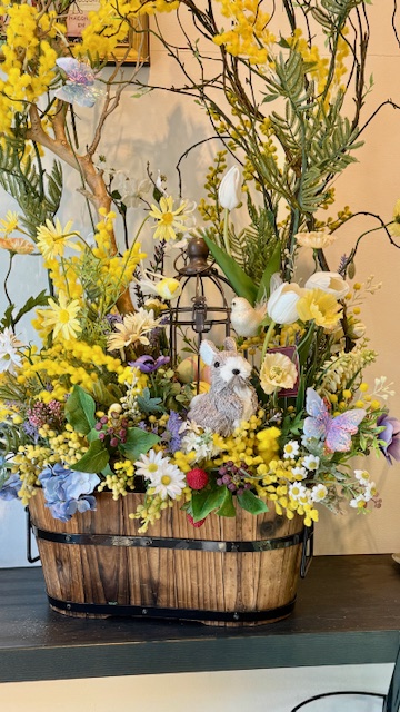 ミモザや春の花畑にイースターエッグの入った鳥かご。ウサギさん」と小鳥や蝶々…