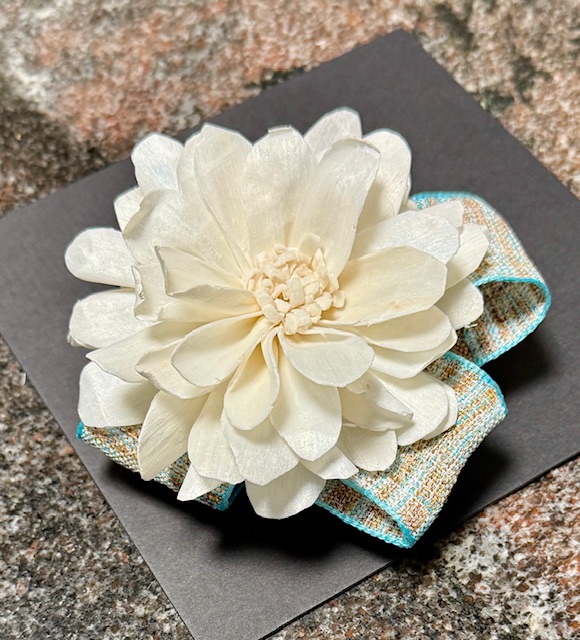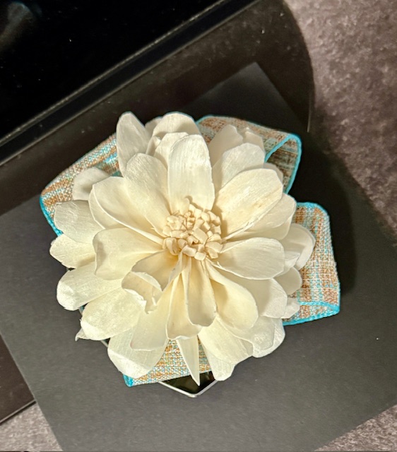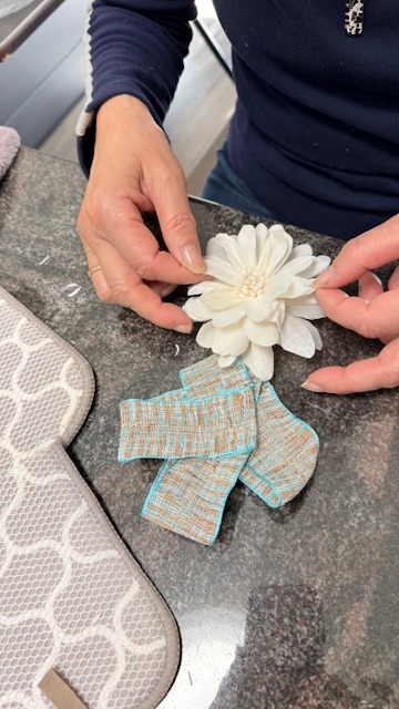 ホワイト系のスーツ、紺色のバックに合うブルーのツィードリボンを付けて
