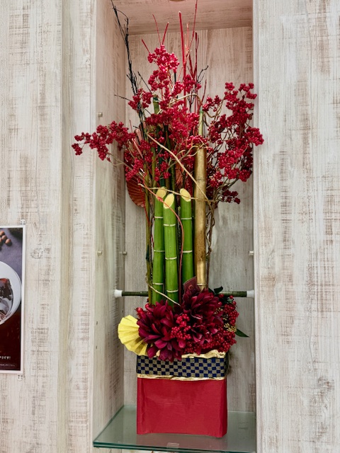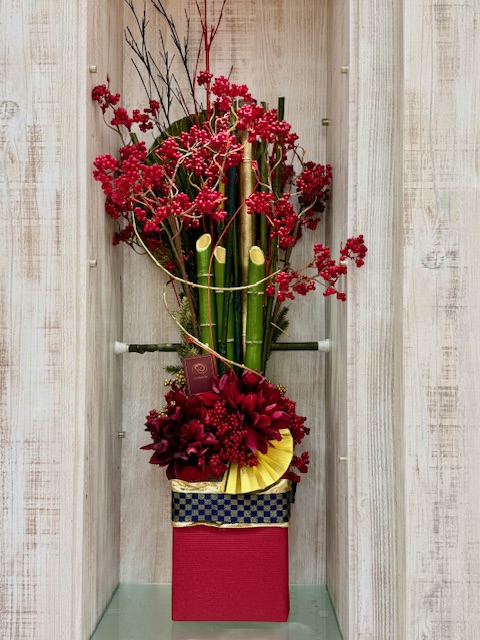 青竹、黒に金掛けの竹、黒と赤の笹竹、赤い南天と牡丹花